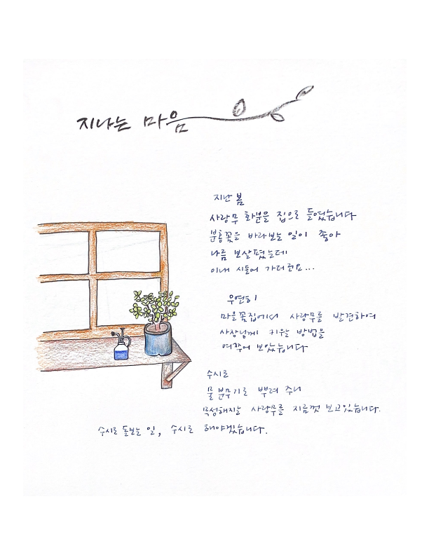 소식지/지나는 마음 수시로 돌보는 by 인권연대 숨 2024. 7. 26. 공유하기 게시글 관리 인권연대 숨 저작자표시 비영리 변경금지 (새창열림) '소식지 > 지나는 마음' 카테고리의 다른 글 지나는 마음 (0) 2024.09.26 인정과 공감 (0) 2024.08.26 붇돋는 마음 (0) 2024.06.25 감사합니다 (0) 2024.05.27 앎과 행함 (0) 2024.04.25 관련글 지나는 마음 인정과 공감 붇돋는 마음 감사합니다 댓글