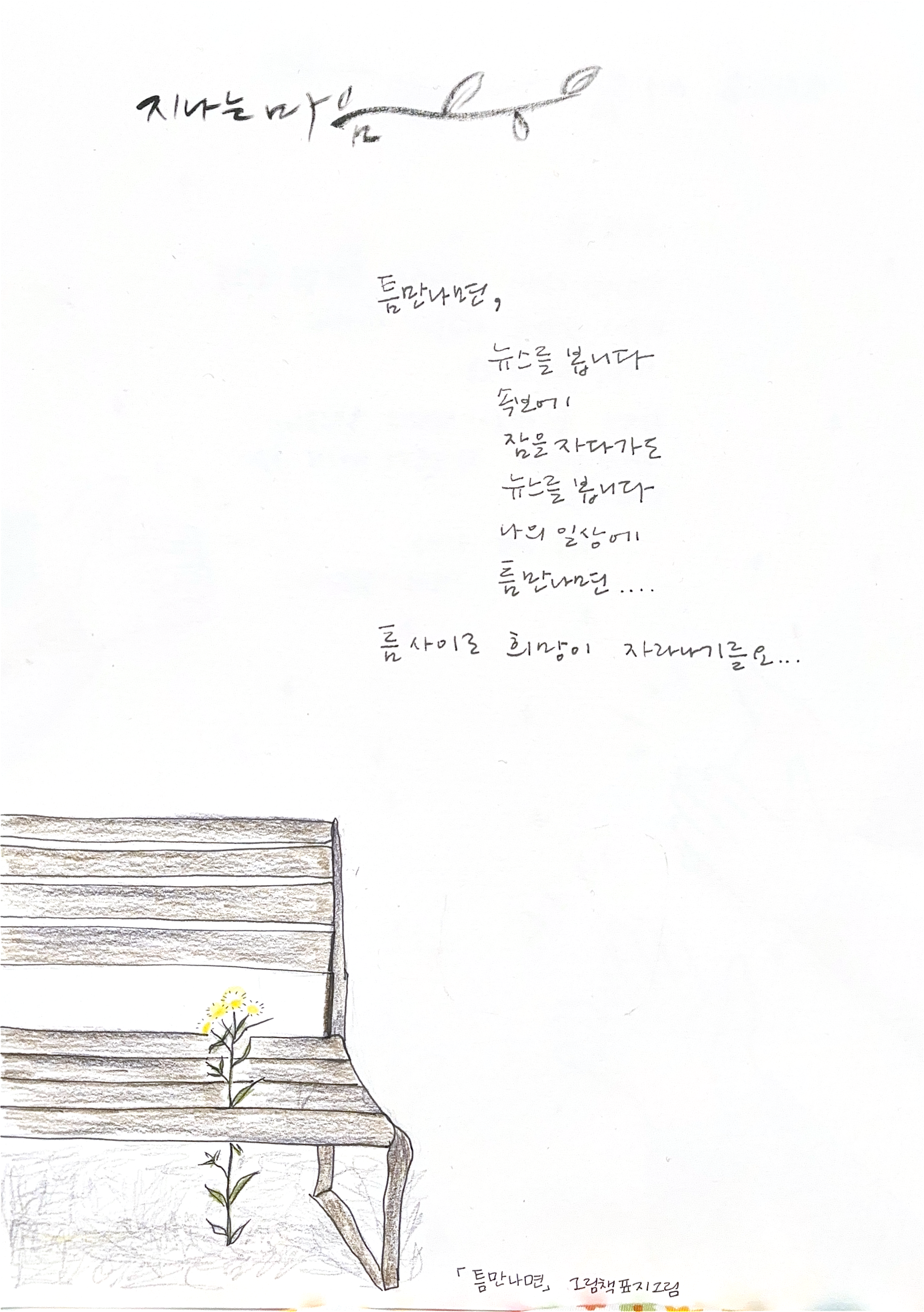소식지/지나는 마음 틈만나면 by 인권연대 숨 2025. 1. 27. 공유하기 게시글 관리 인권연대 숨 저작자표시 비영리 변경금지 (새창열림) '소식지 > 지나는 마음' 카테고리의 다른 글 봄 (0) 2025.03.25 봄 마중 (0) 2025.02.25 한 번도 좋은 시절이 없었던 농민들에게 (0) 2024.12.26 웬만해야지요 (0) 2024.11.25 병든 사과와 일 (0) 2024.10.25 관련글 봄 봄 마중 한 번도 좋은 시절이 없었던 농민들에게 웬만해야지요 댓글
