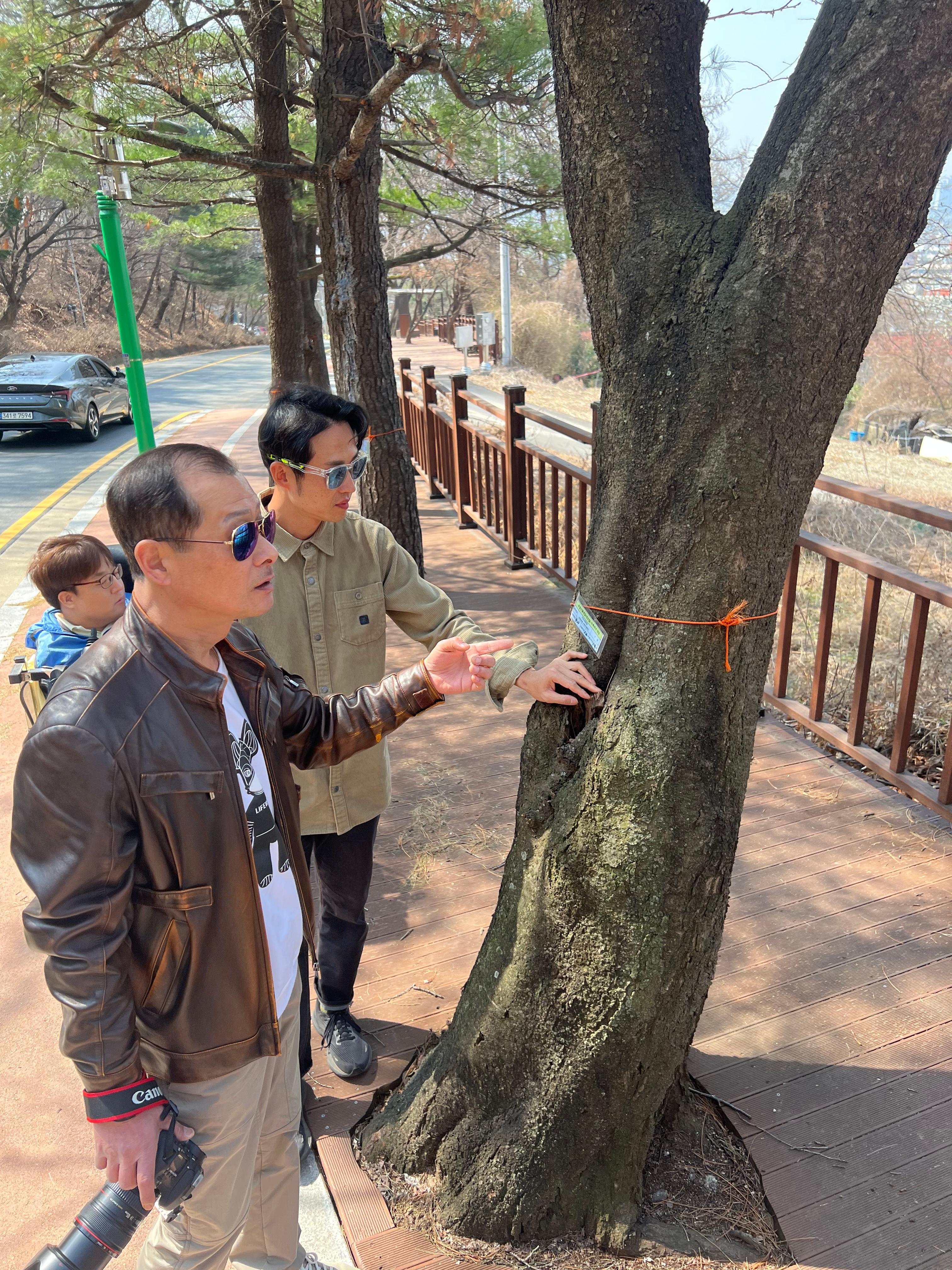우암산 둘레길의 벚나무와 소나무, 목련 등을 살피러 수목관리전문가(아보리스트) 이재헌의 설명을 들으며 걸었다.