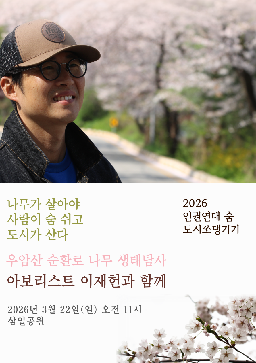 도시쏘댕기기/2026년 도시쏘댕기기 아보리스트 이재헌과 함께 - 우암산 순환로 나무 생태 탐사 3월22일(일) 오전 11시 삼일공원 by 인권연대 숨 2026. 3. 13. 공유하기 게시글 관리 인권연대 숨 저작자표시 비영리 변경금지 (새창열림) '도시쏘댕기기 > 2026년 도시쏘댕기기' 카테고리의 다른 글 아보리스트 이재헌과 함께 참가자 후기(2026 도시쏘댕기기) (1) 2026.03.23 관련글 아보리스트 이재헌과 함께 참가자 후기(2026 도시쏘댕기기) 댓글