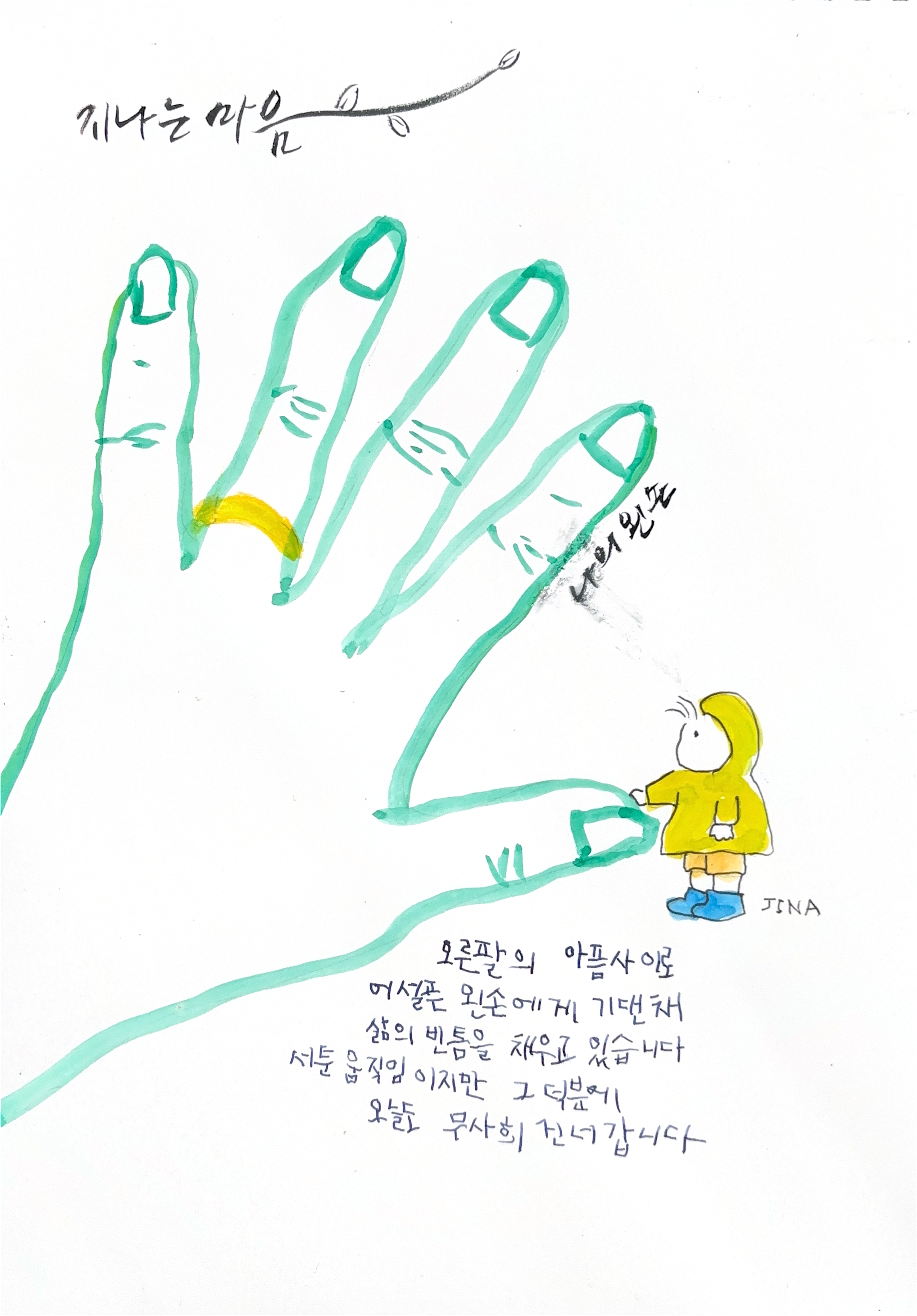 소식지/지나는 마음 왼 손 by 인권연대 숨 2026. 4. 27. 공유하기 게시글 관리 인권연대 숨 저작자표시 비영리 변경금지 (새창열림) '소식지 > 지나는 마음' 카테고리의 다른 글 안녕, 아빠... (0) 2026.03.25 2026년 말의 힘으로 웃음 꽃이 피어나기를 (0) 2026.02.26 팥죽 한 그릇 (0) 2025.12.26 어느 사이... (0) 2025.11.26 아이의 소원 (0) 2025.10.27 관련글 안녕, 아빠... 2026년 말의 힘으로 웃음 꽃이 피어나기를 팥죽 한 그릇 어느 사이... 댓글