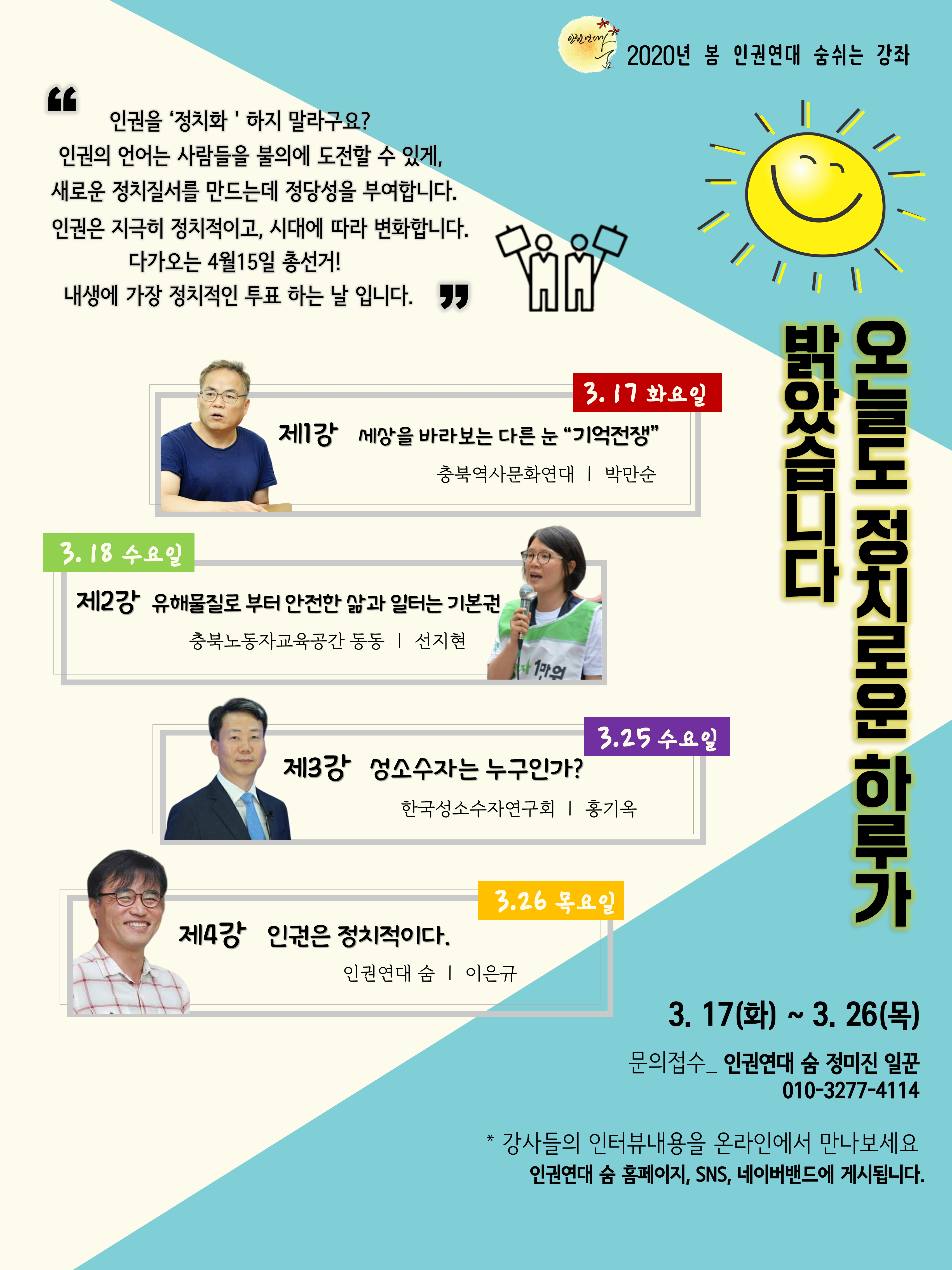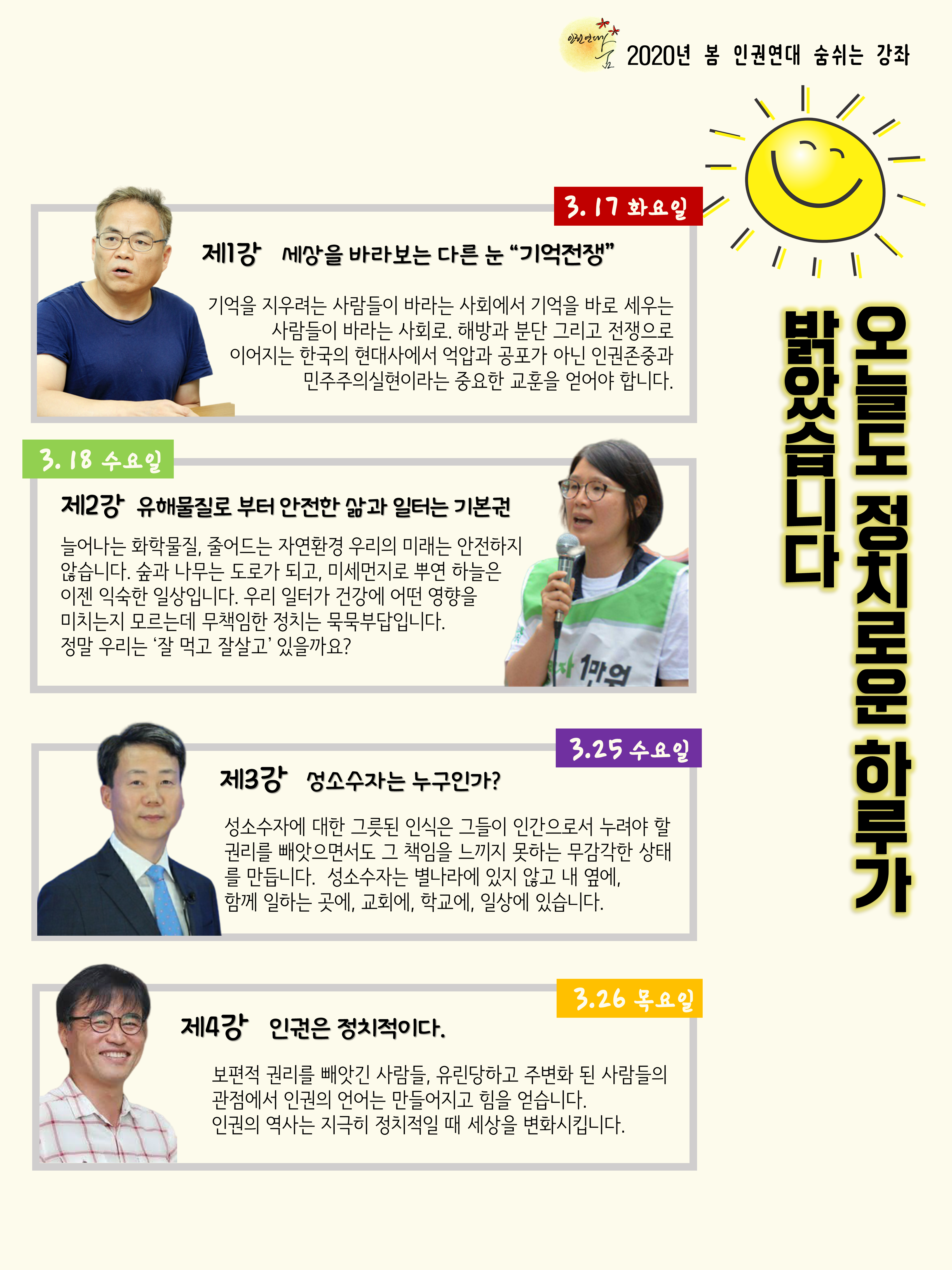 3월17일~26일 진행예정이었던 <2020 봄 인권연대 숨 쉬는 강좌>를 6월로 연기합니다.