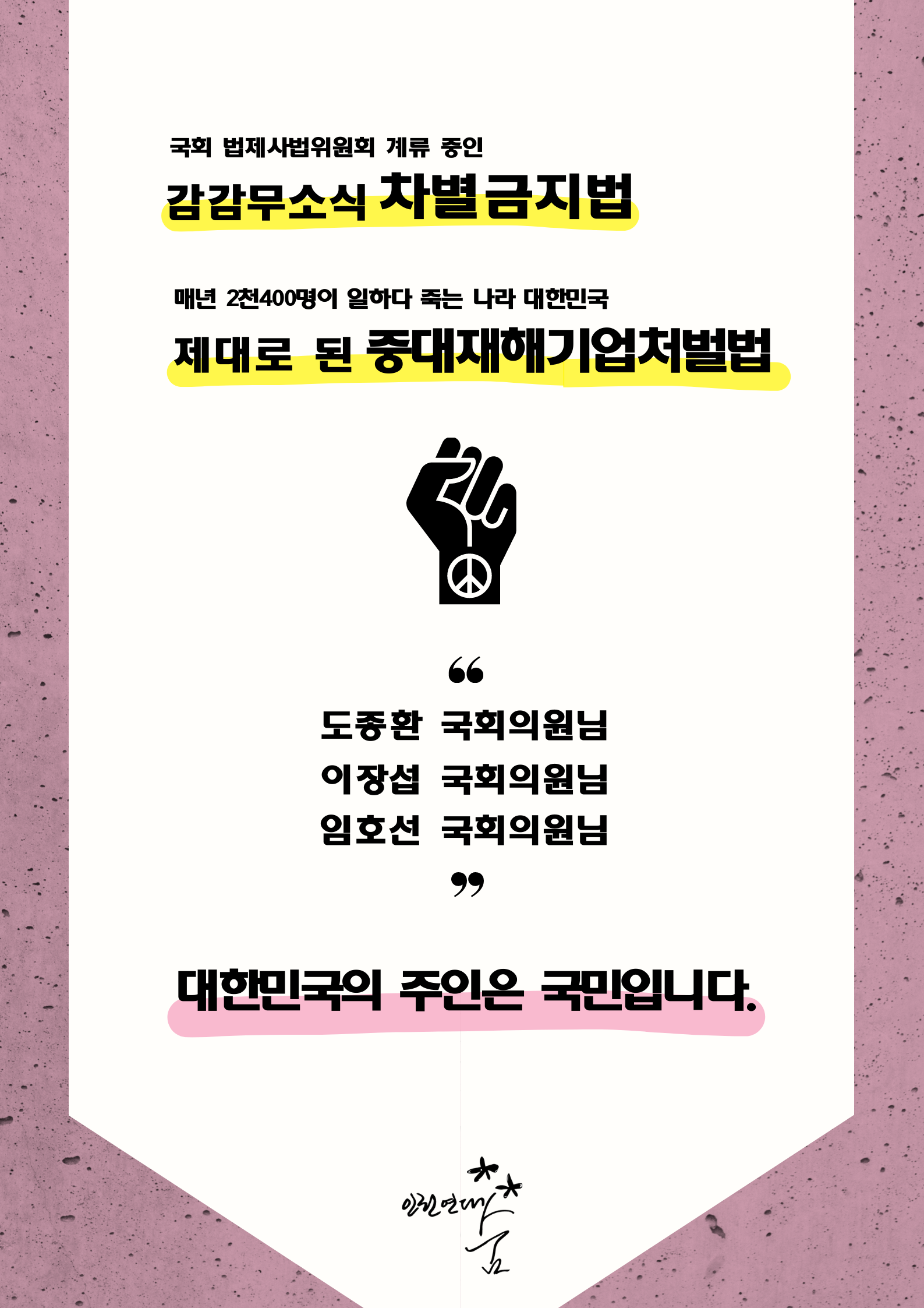 더 이상 미루지 말고 당장 차별금지법! 중대재해기업처벌법! 을 외칩니다.