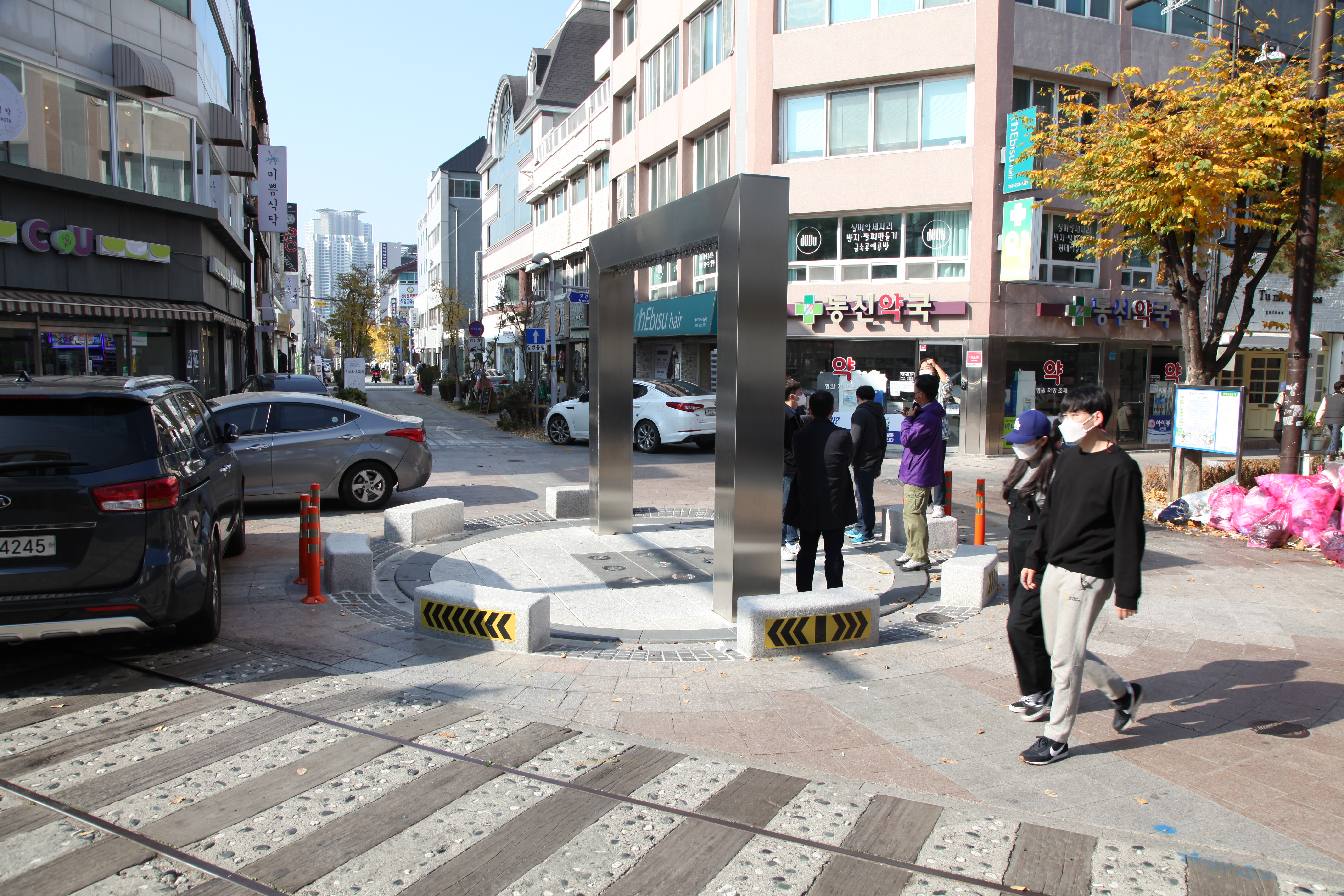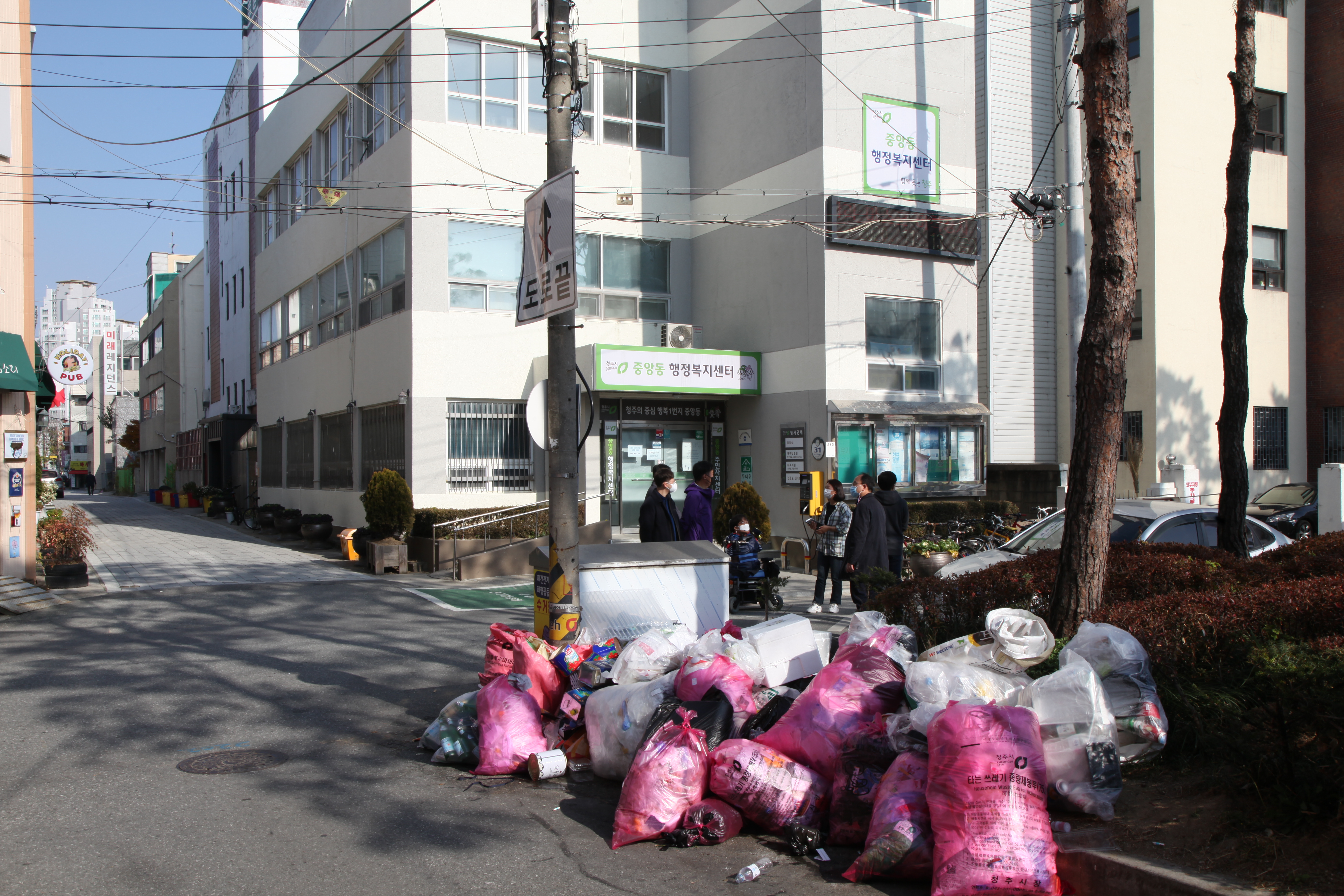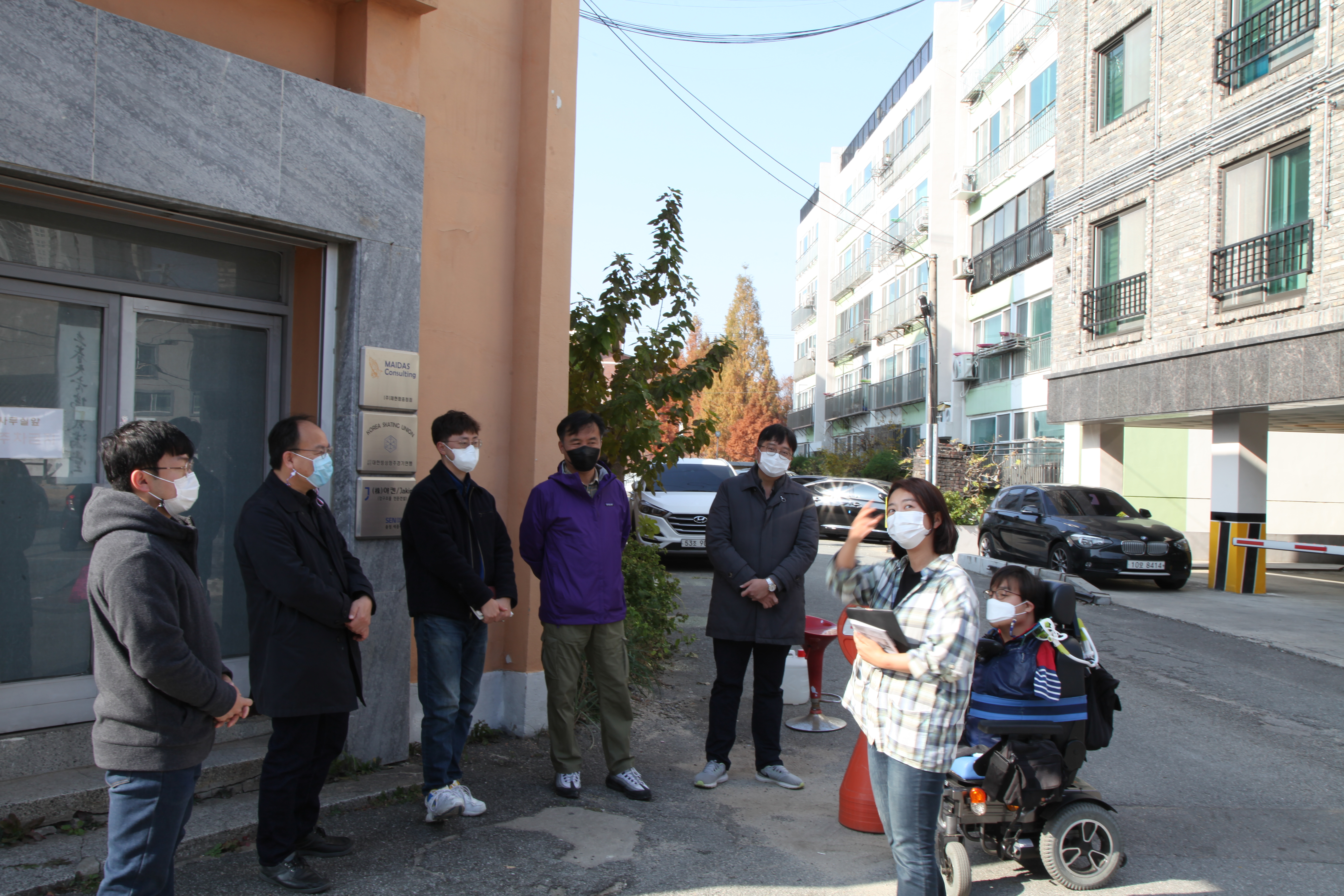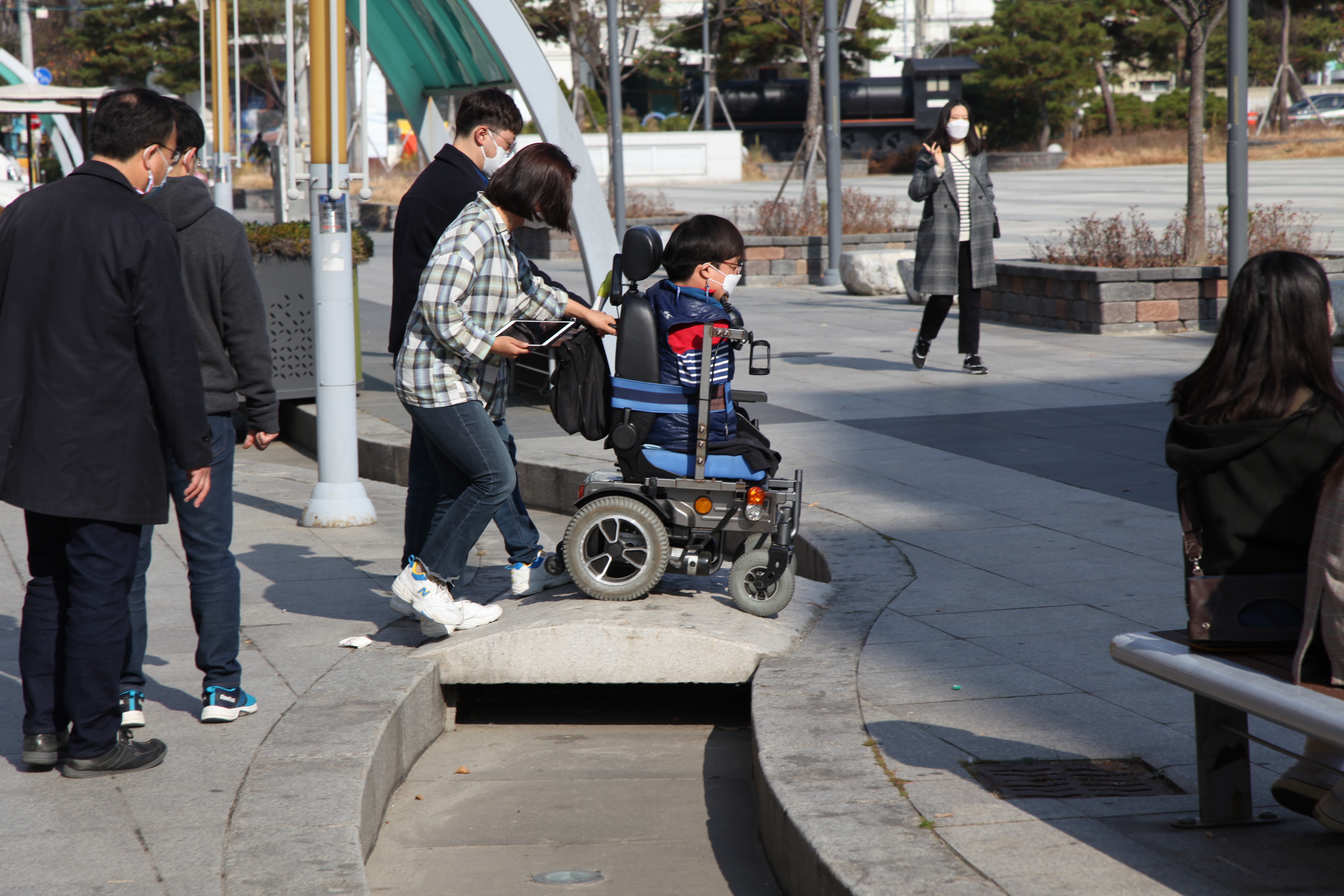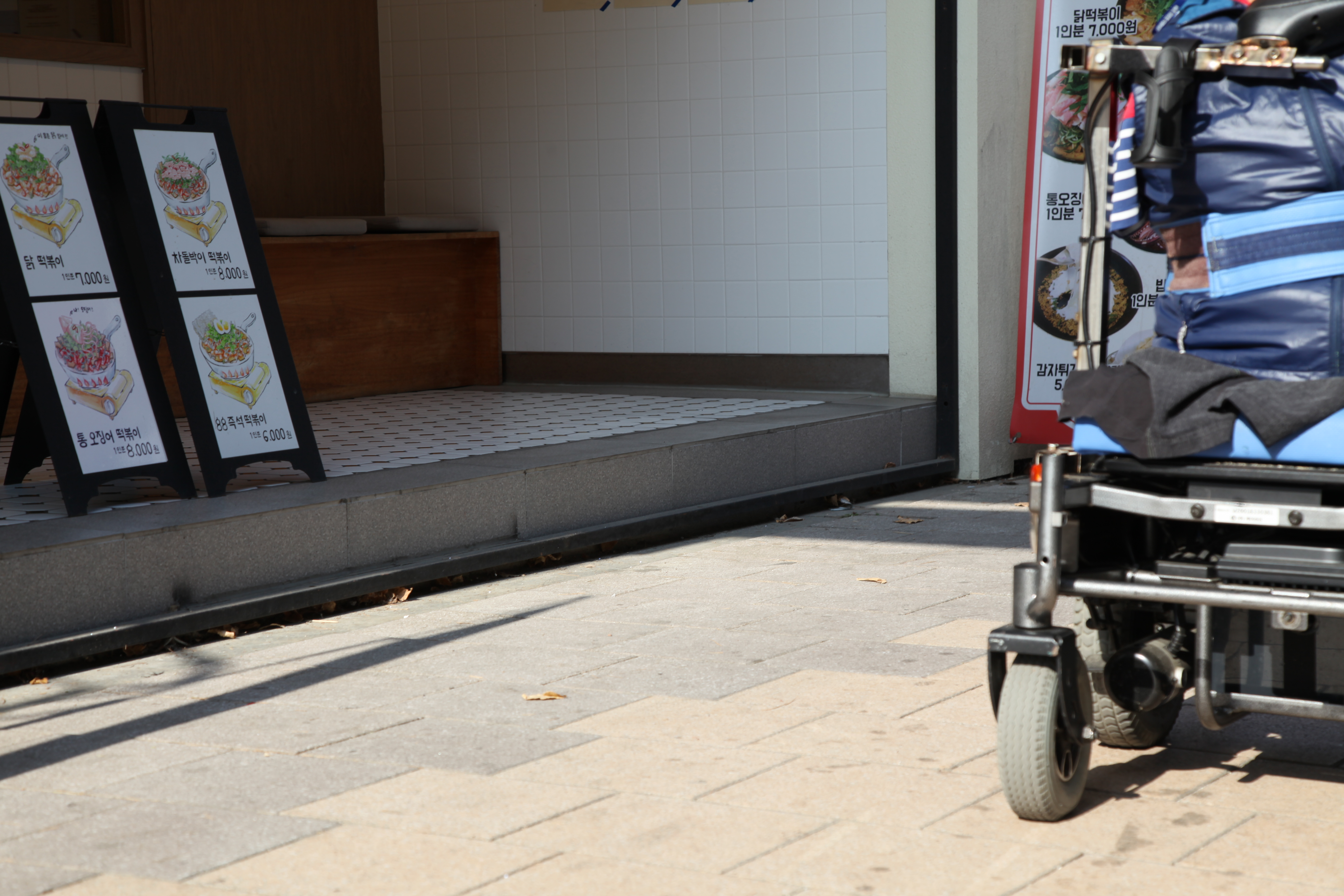 인권연대 숨 사무실도 위치해있는 중앙동은 수백억의 비용을 들여 도시재생센터 설립, 청주 역 재건사업, 소나무 거리조성, 주물 특화거리조성, 보행권개선 사업 등을 진행했지만 직접 방문해보니 부자연스러운 경관, 불편하고 좁은 보행로를 마주하게 되었습니다. 차들은 보행 개선사업을 진행한 도로 위에 올려져 있기도 했습니다. 수많은 상가들이 휠체어 진입이 불가능했으며 공용화장실(휠체어 사용 가능한)도 보이지 않았습니다.