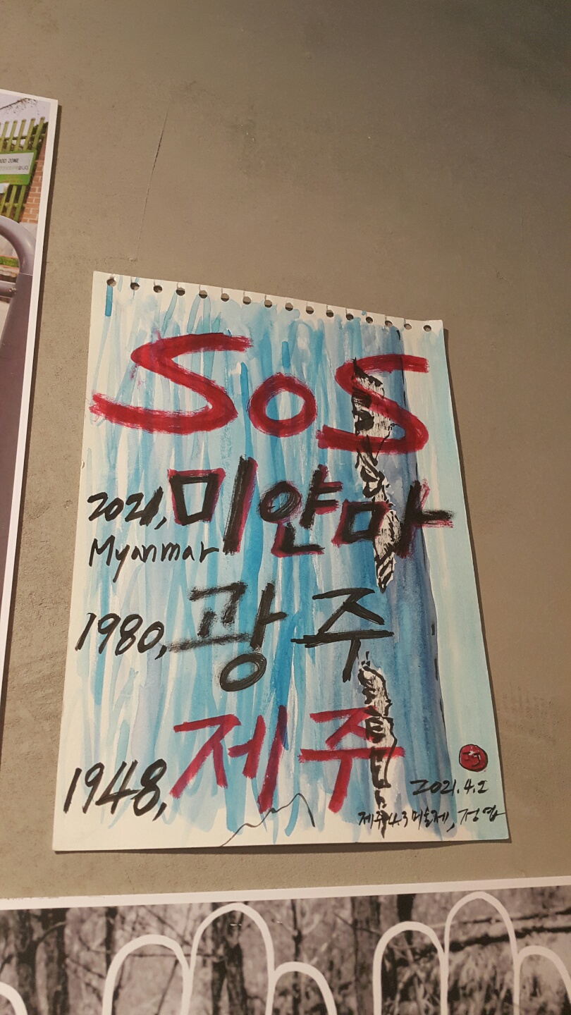 셋째 날은 호우주의보가 예고되었지만 생각보다 날씨가 좋아 숙소에서 점심을 먹고 제주 시내의 이아 미술 전시관을 다녀왔다. 매년 4월마다 4.3을 주제로 새로운 작품들을 전시를 한다고 한다. 다양한 작품들 속에서 예술가들이 표현하는 제주의 4월을 느껴볼 수 있었다. 굴곡지지만 굳건하고 시원하게 뻗어있는 팽나무를 그린 그림은 제주의 역사를 잘 드러내 주는 것 같았고 핏물이 차 있는 동굴 안에 사람들의 눈이 그려져 있는 그림의 경우 당시 사람들의 고통과 한이 느껴지는 작품이었다. 한국의 제주 4.3 항쟁, 광주 5.18 민주화운동과 같은 저항의 역사와 현재 미얀마에서 이루어지는 군부에 의한 국가폭력과 여기에 저항하는 민주화운동의 상황을 연결하고 연대하는 작품도 인상적이었다. 전시회를 다녀온 후 제주 시장을 한 바퀴 돌고 숙소로 돌아왔다.