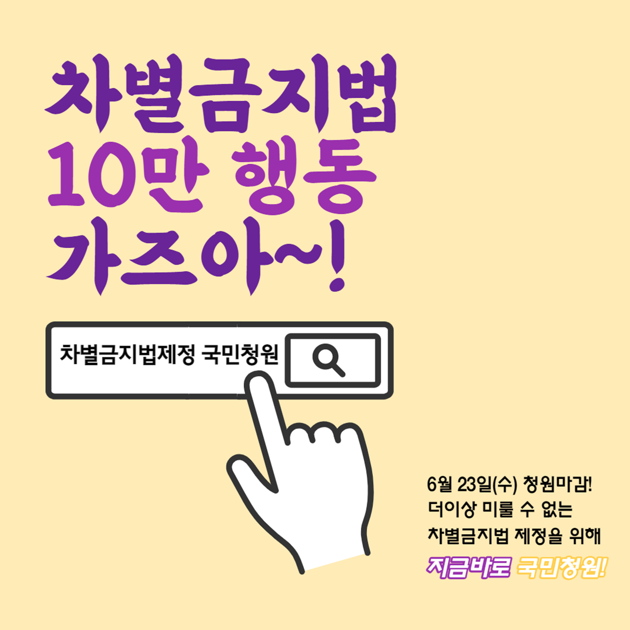 ▶▶ 차별금지법 제정 국민동의청원 바로가기 : https://bit.ly/equality100000