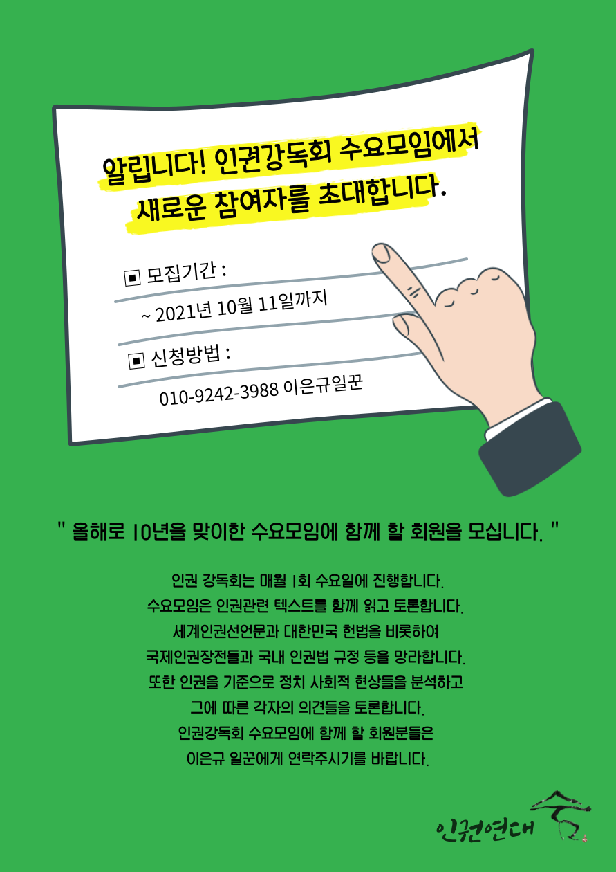 인권강독회 수요모임에 함께 할 회원분들은 이은규 일꾼에게 연락주시기를 바랍니다.