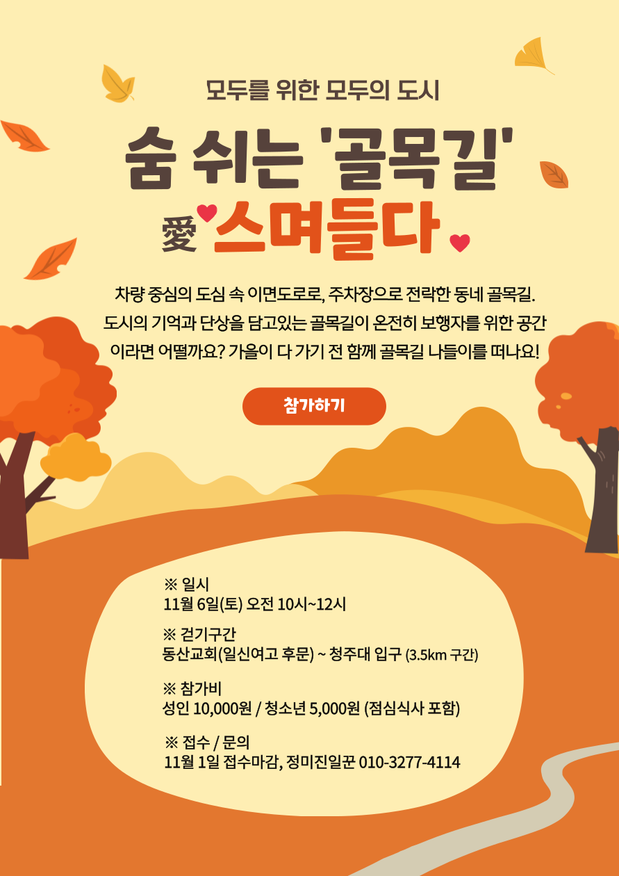 11월 6일(토) 오전 10시! 일신여고 후문 동산교회부터 청주대 입구까지 골목길 나들이를 떠납니다. 함께하세요 ^^