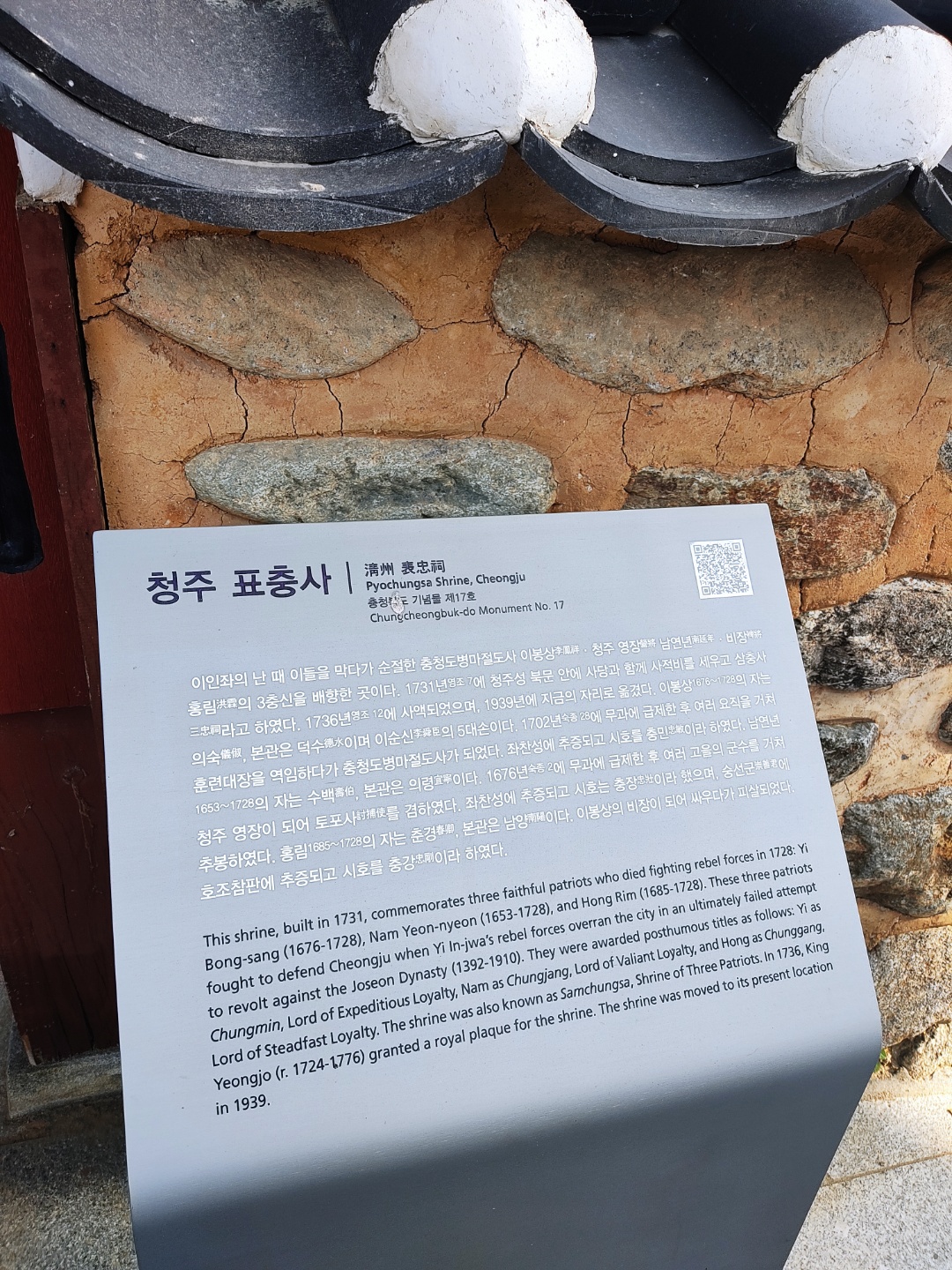 내부는 들어가 볼 수 없었지만, 조선 중기 때 문신인 이봉상(1676~1728)·남연년·홍림의 위패를 모시고 있는 사당이라고 적혀있습니다. 1731년(영조 7년) 청주 읍성 북문 안에 사당을 세웠다가 1939년 지금의 자리로 이동했다고 합니다.