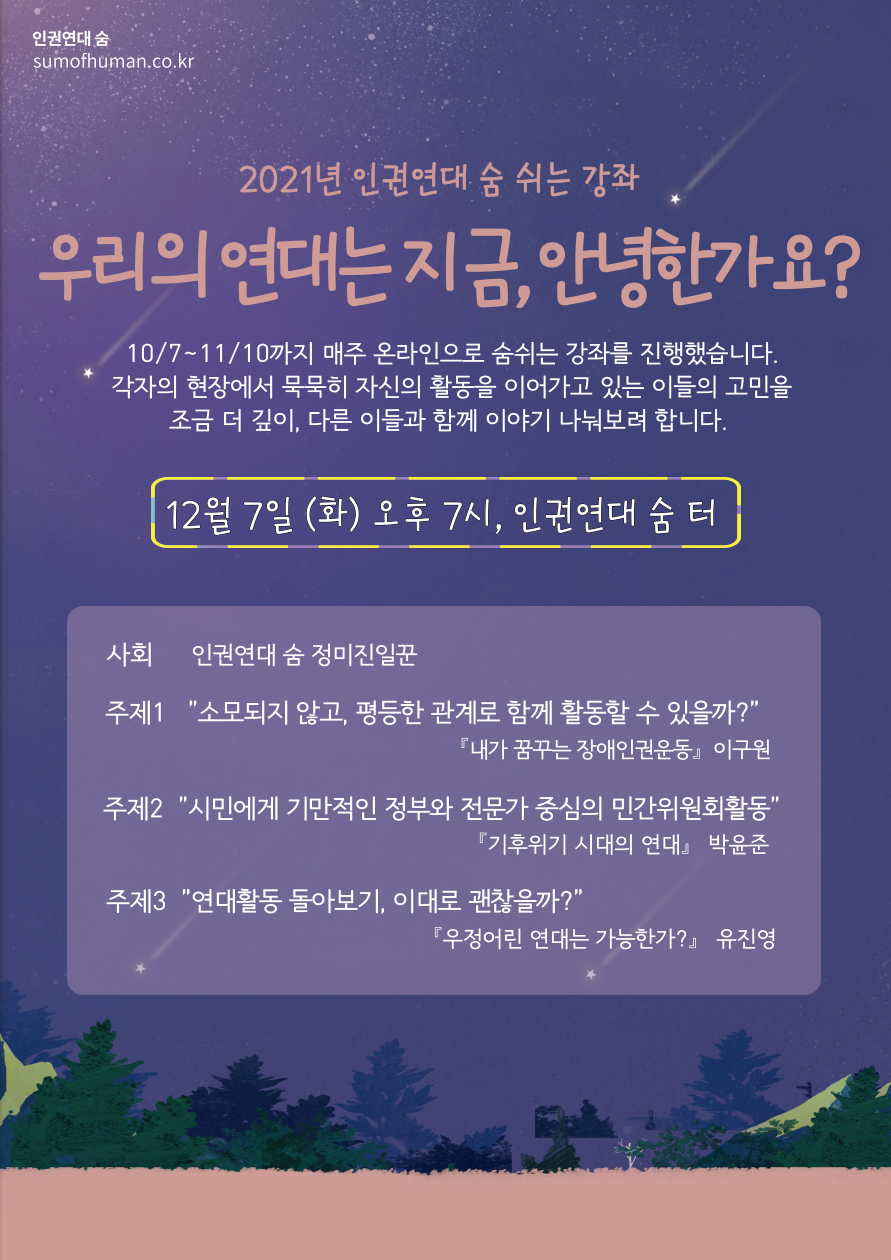 | <모집> 2021년 인권연대 숨 쉬는 강좌 : 우리의 연대는 지금, 안녕한가요? (0) | 2021.09.16 |