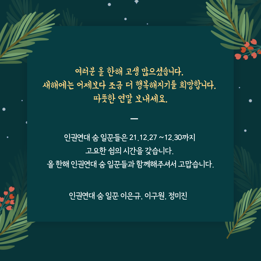 카테고리 없음 올 한해 인권연대 숨 일꾼들과 함께해주셔서 고맙습니다. by 사람이 되어 숨을 쉬었다. 2022. 1. 11. 공유하기 게시글 관리 인권연대 숨 저작자표시 비영리 변경금지 (새창열림) 댓글