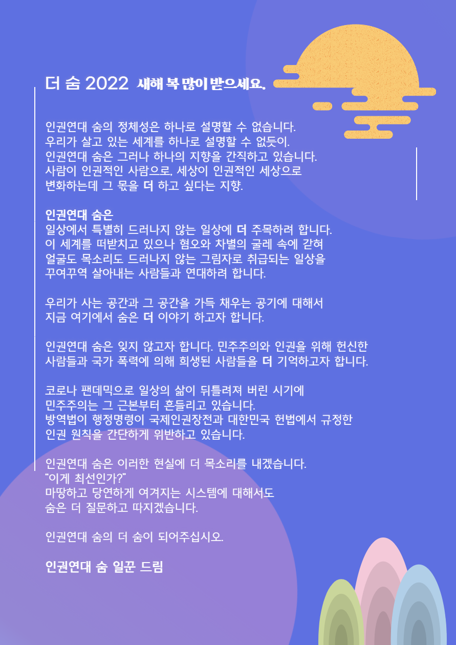 | < 2022년 3월 23일 인권연대 숨 창립 10주년> 잘 마쳤습니다. (0) | 2022.03.24 |