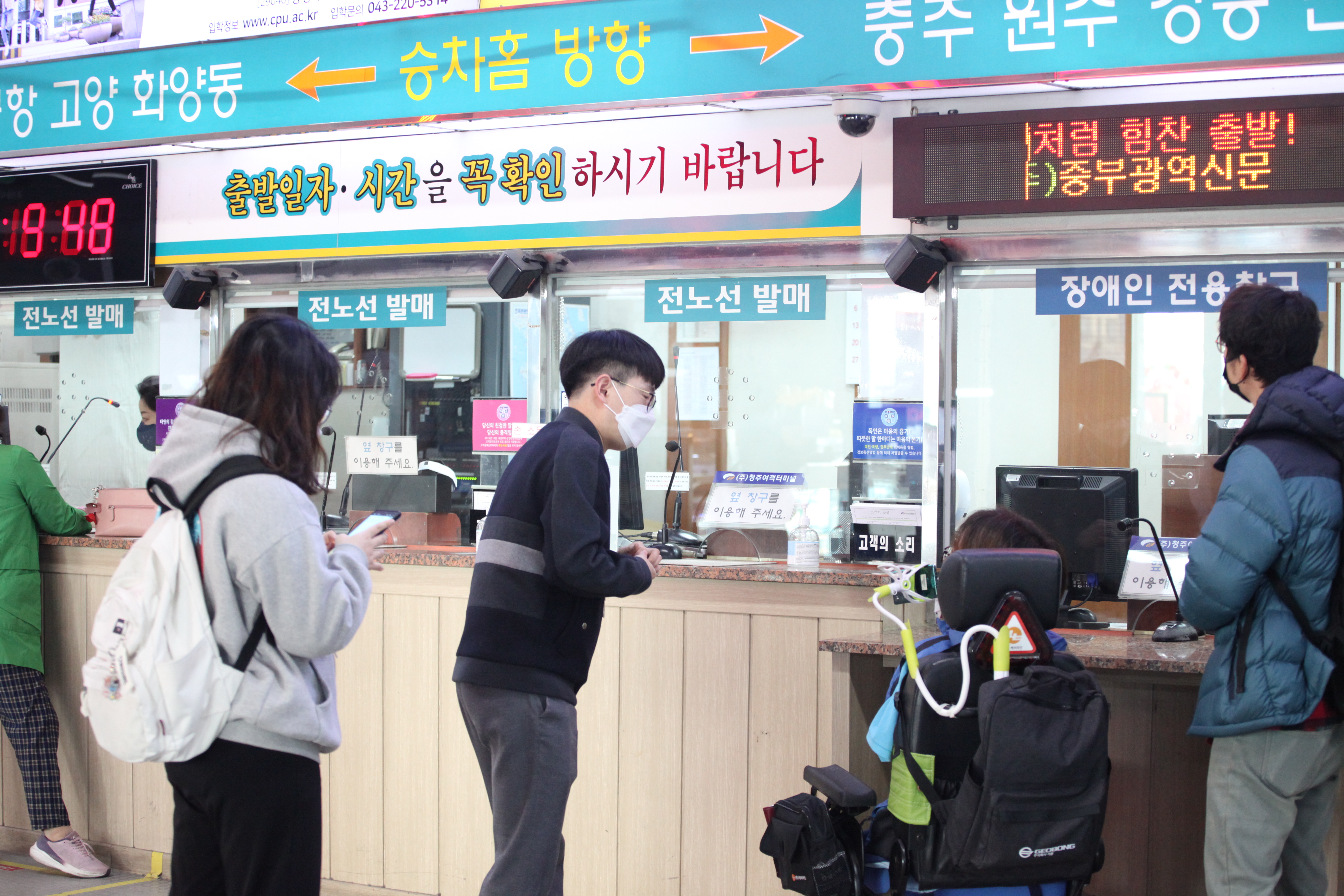 청주 시외버스터미널 장애인 전용창구 담당 직원에게 탑승가능한 시외버스를 문의하는 중