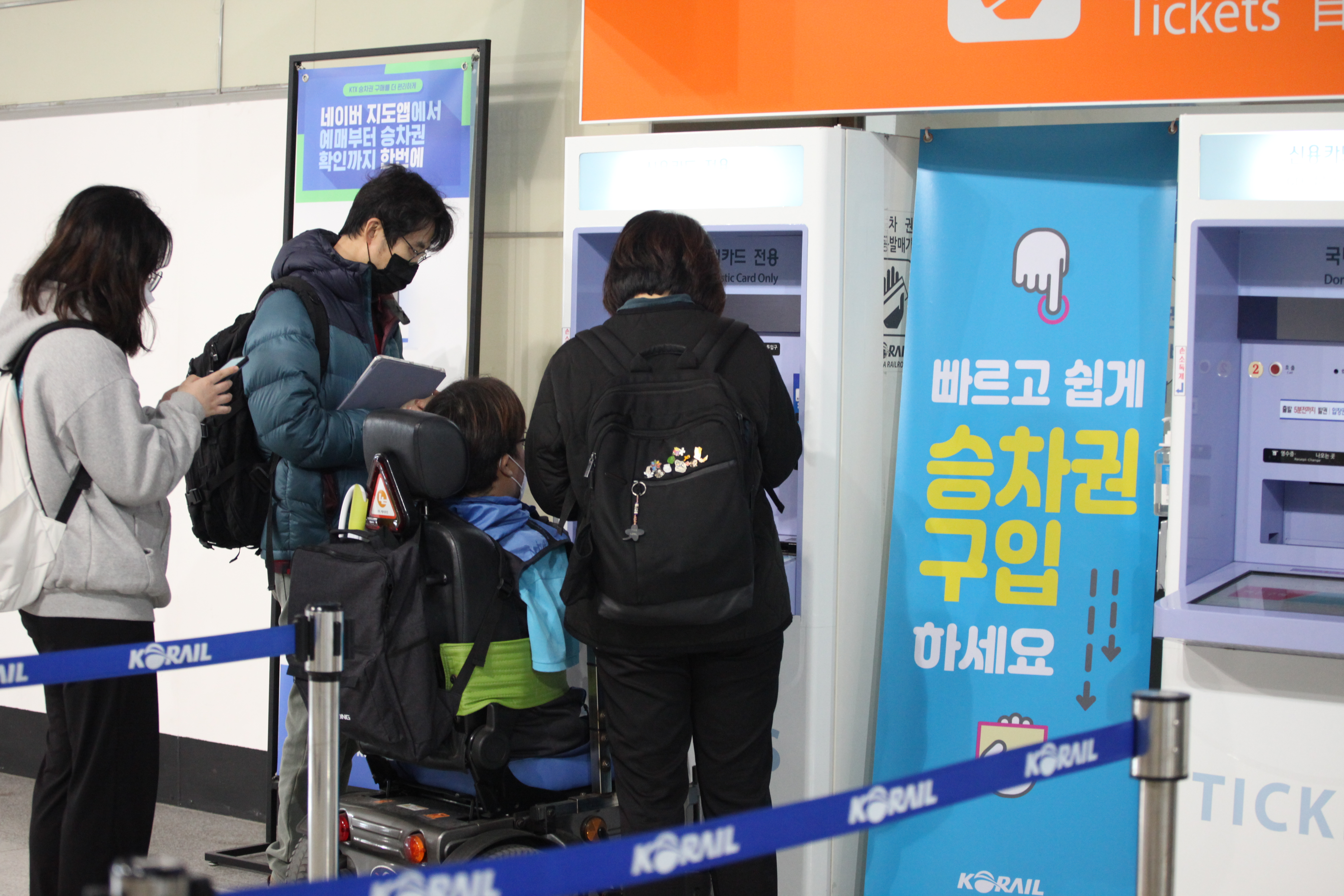 (왼쪽) 자동 매표소에서 이용가능한 열차를 확인 중 (오른쪽) 매표소 직원에게 직접 이용가능한 열차를 확인 중