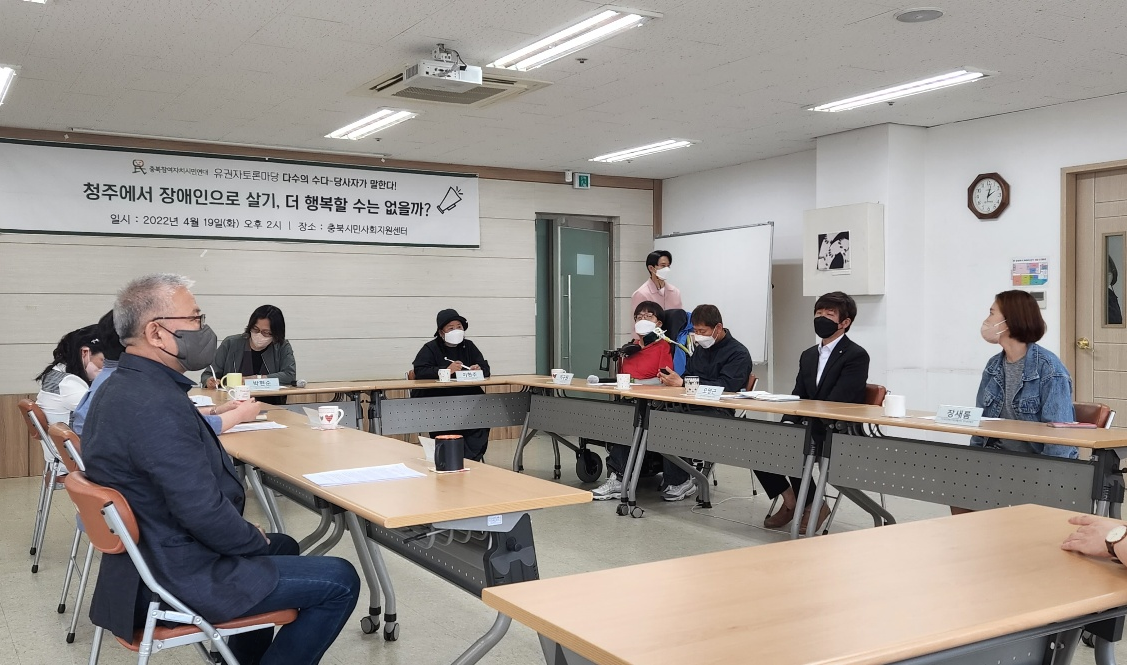 419일 충북참여연대 주최로 충북시민사회지원센터에서 진행한' 장애인권 유권자 토론회'에 참여하였습니다. 청주에서 활동하고 있는 장애인권 활동가들과, 장애인당사자의 부모님과 함께했습니다. 지난 코로나 기간 동안 겪은 차별의 경험과 이동권의 현실, 평생교육 기관 및 노동권 보장의 필요성, 참정권에 대한 이야기를 나누었습니다.