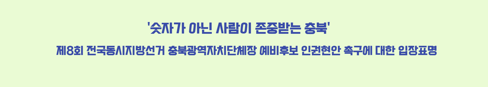 6월 1일 전국동시지방선거를 앞두고 인권연대 숨은 지난 5월 3일 충북도 광역자치단체장 예비후보 2인에게‘숫자가 아닌 사람이 존중받는 충북’ 충북지역 인권현안 촉구안을 전달했습니다. 이에 국민의 힘 김영환 예비후보는 별도의 입장을 표명하지 않았고, 더불어민주당 노영민 예비후보는 지난 5월 9일 촉구안에 대한 입장 표명을 하였습니다.