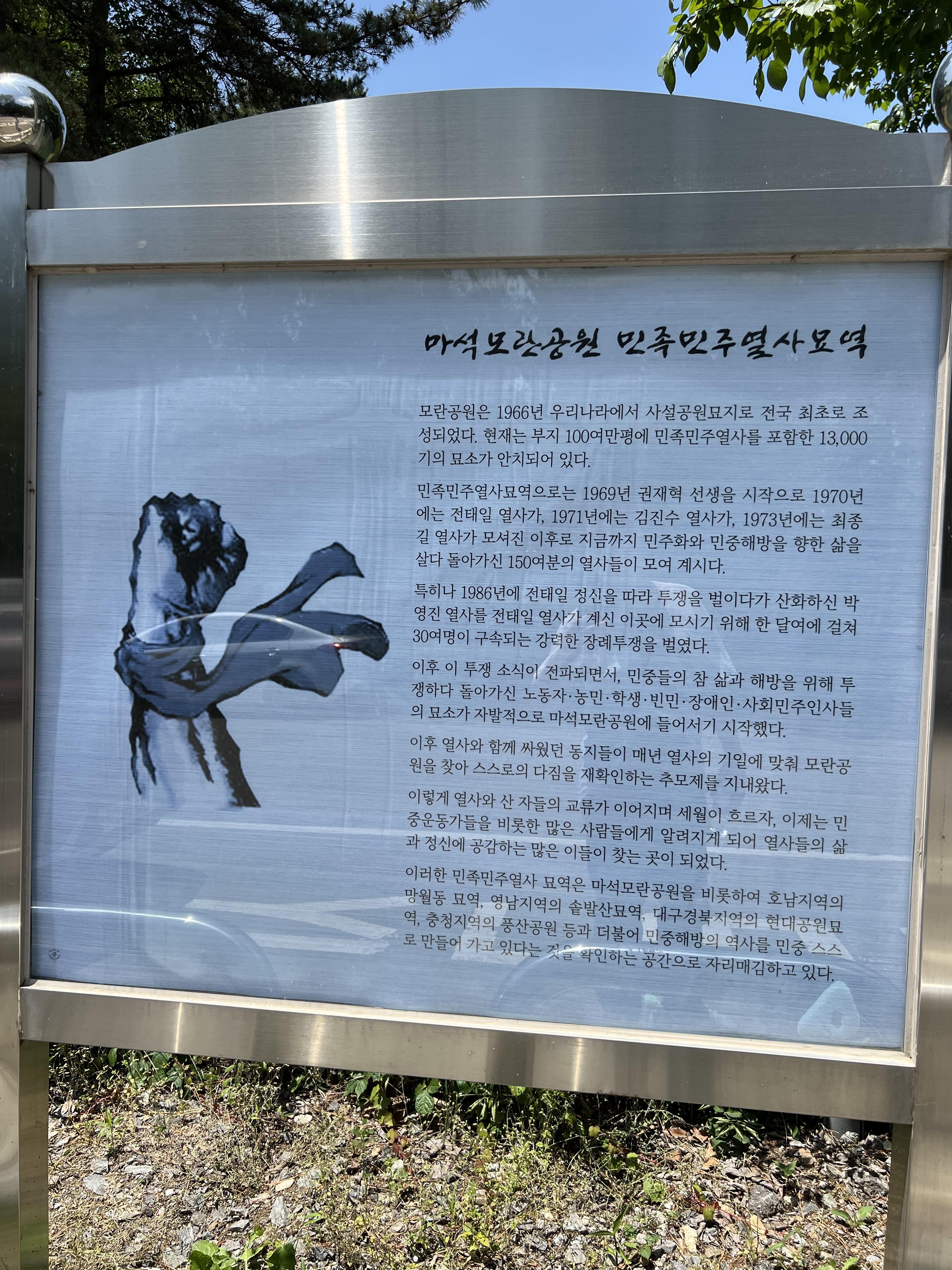 경기도 남양주에 위치한 마석모란공원은 1966년 한국 최초의 사설 공원묘지로 1969년 권재혁선생, 1970년 전태일열사, 1971년 김진수열사, 1973년 최종길열사가 모셔진 이후 40여년에 걸쳐 민주화운동, 통일운동, 사회운동, 노동운동, 학생운동을 향한 삶을 살다 희생하신 150여분의 열사들이 모여있는 묘역입니다. 1968년 전태일 열사의 정신을 이어받아 노동현장에서 투쟁하신 박영진 열사를 모란공원에 안장하기 위해서 한 달여 걸친 장례투쟁으로 30여명 이상이 구속되는 사건 이후, 모란공원에는 노동자, 민중의 권리 쟁취와 해방을 위해 투쟁하던 많은 민주열사들이 모셔지게 되었습니다.
