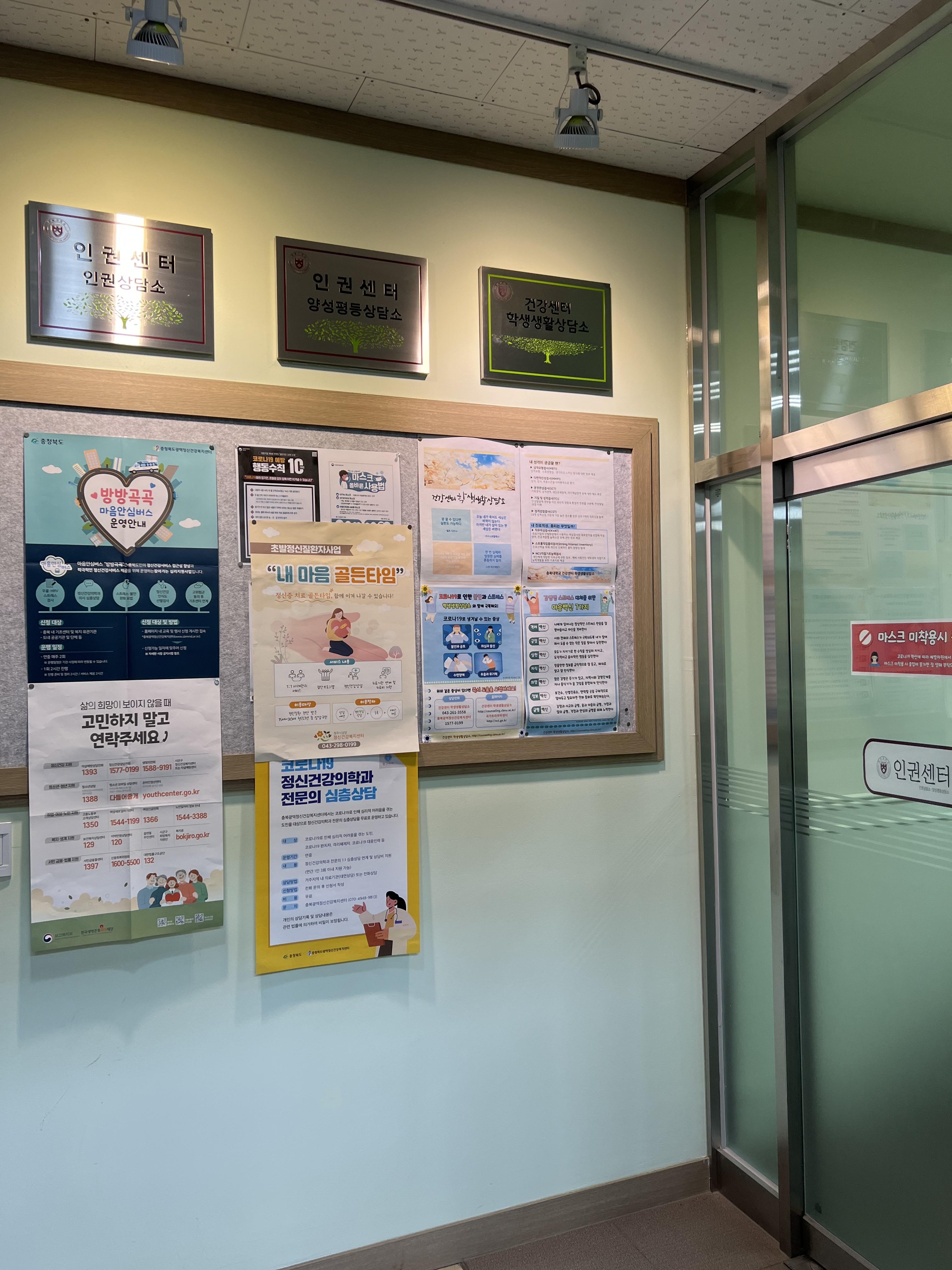 다음은 제 1학생회관 3층에 위치해있는 <인권센터>에 방문했습니다. 접근성이 좋은 위치는 아니었습니다. 충북대 인권센터는 교육부의 인권센터설치를 법률로서 의무화 하기 이전인 2015년 설치되어 작년에는 시설정비도 많이 이루어져 상담공간이 분리, 확충되어 피·가해자가 접촉하는일이 발생하지 않도록 조치하였다고 합니다.