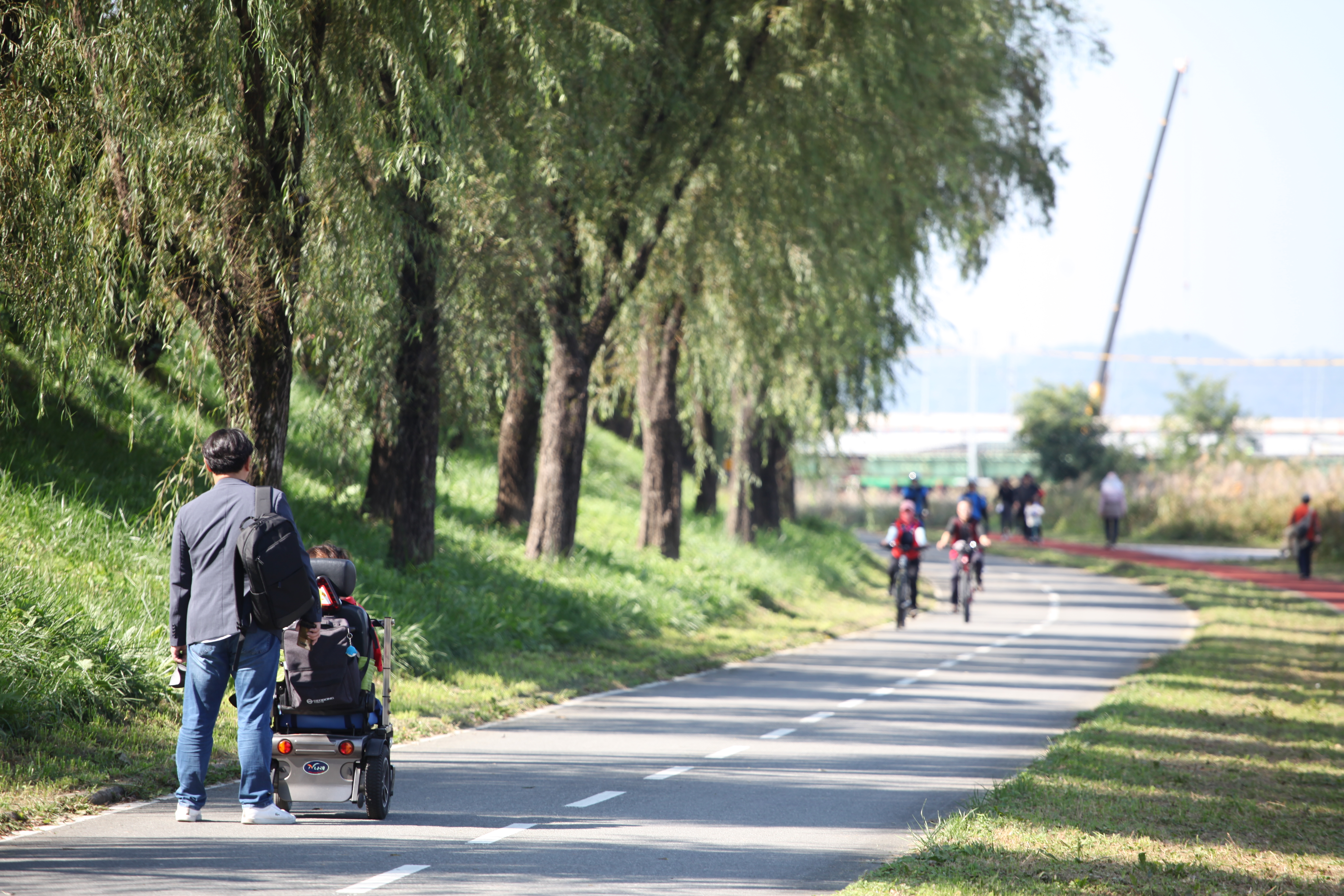문암생태공원으로 직접 가는 920번 버스는 2대만 운행 중이었는데요. 그 중 한 대만이 저상버스였으며 배차간격이 1대당 약 30분 꼴이었습니다. 25분 뒤에 도착하는 버스는 비저상버스였기에 다시 정류장을 옮겼고 문암생태공원 주변으로 향하는 40-1번 버스에 탑승하였습니다. 휠체어 이용객이 있음을 버스에서 확인하지 못하고 지나칠 뻔했으나 함께 동행한 분이 버스에 들어가 이야기해 주었습니다. 버스 여러 대가 밀려들어오는 시내 특성상 저상버스 리프트와 정류장의 간격을 맞추어 조정하는 게 쉽지는 않았지만 무사히 탑승할 수 있었습니다. 다행히 버스 기사님이 친절했으며 저상버스를 탄 이후 처음으로 안전장치 설치할 건지도 물어봐 주어서 편한 마음으로 버스를 타고 푸르지오 우미린 아파트 방면까지 이동했습니다. 버스에서 내려 자전거 도로로 걸어가며 문암생태공원에 도착하였습니다. 인도도 있었지만 인도와 자전거도로를 잇는 길이 잔디밭이었고 쌍방보행하기에는 도로가 좁은 편이었습니다.