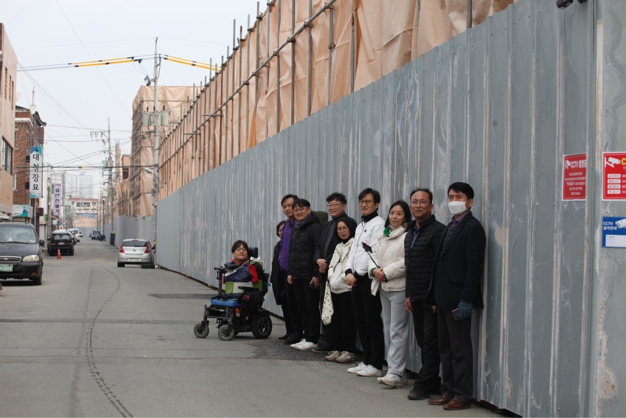 난 항상 시골에 살아서 재개발이 진행되는 도시는 살아보지 못했다. 이런 건 서울이나 있는 것인 줄 알았는데 청주에도 진행되는 일이었다. 영어학원을 가는 길에 언뜻 재개발사무실이 보였었는데 오늘은 그 곳을 자세히 살펴보기로 했다. 아직도 홍수 피해로 피폐해진 무심천을 건너 사직동 재개발이 한창 진행되는 곳으로 이동했다. 먼저 공사가 진행되는 중이라 공사 가림막이 3층정도의 높이까지 쳐져있었다. 철거가 시작된 곳이라 먼지들이 많았었다. 환경을 위해서는 먼지들이 적게 나기위한 조치들이 취해져야 한다고 인권연대 숨 일꾼님이 말씀하셨다. 미세먼지가 많아지는 계절이라 더 예민하게 받아지게 되었다.