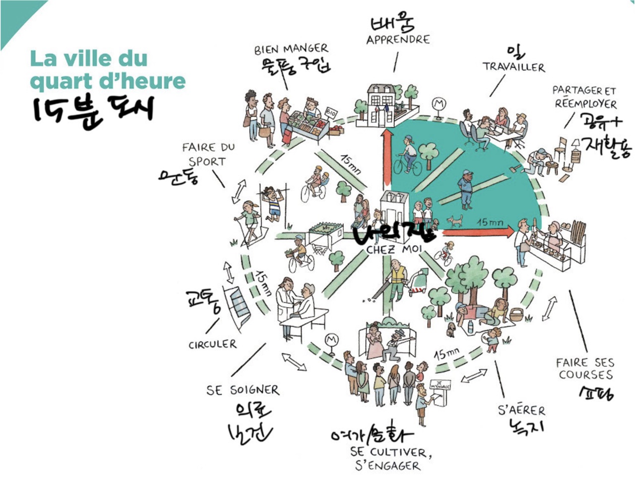 “‘15분 도시’를 생각한다는 것은 도시민들이 자신의 삶의 시간을 사용하기 위해 도시가 무엇을 제공해야 하는지를 심도있게 질문하는 것이다. 강력한 전문화에 기반해 분할된 공간 생활방식은 인간에게 가장 소중한 것, 즉 시간의 ‘도난’으로 귀결된다. 그렇기 때문에 새로운 시간도시계획이 어떻게 하면 도시 본연의 필수적 사회기능을 충족시키면서 평온한 도시를 제공할 수 있는지, 해답을 제시하면서 앞으로의 여정을 구조화하는 축이 되어야만 한다. 이제 더는 도시를 개발하지 말고 도시에서의 삶을 개발해야 한다. 여전히 도심과 각기 다른 용도지역 지구를 유지하면서 단일 기능만을 수행하는 공간을 네 가지 주요 요소 – 근접성, 혼합성, 밀도, 편재성-에 의해 지탱되는 다중심적인 도시로 변화시켜야 한다.”