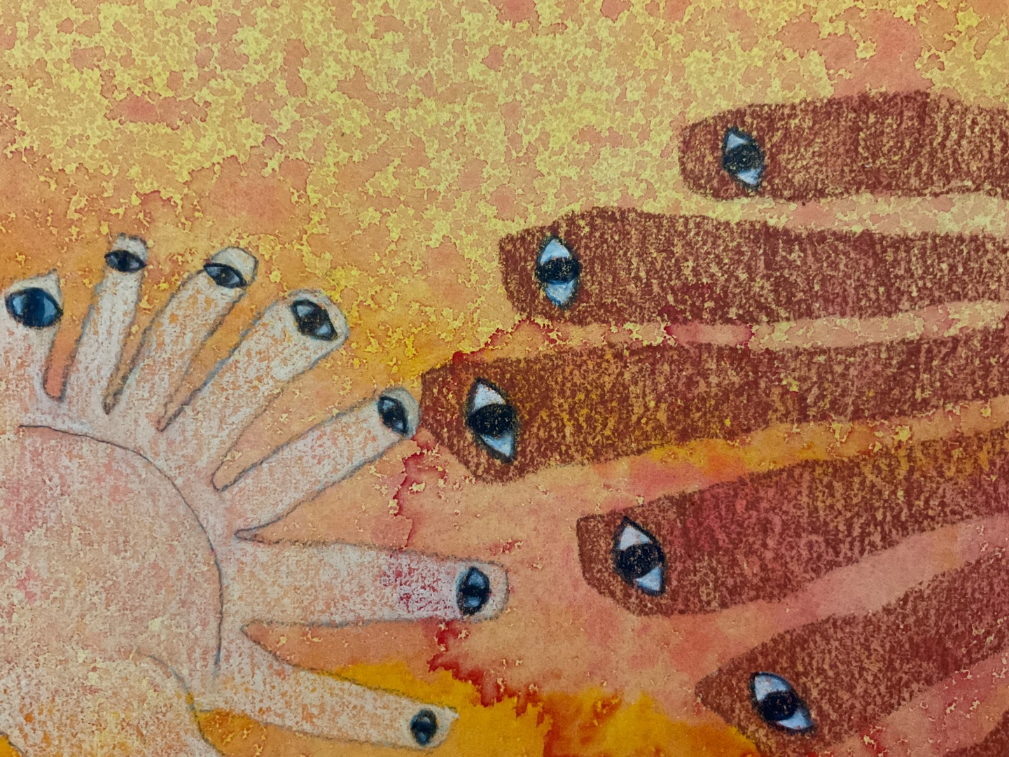 2023년 11월 6일 월요일 오늘의 새벽 작업. 4시 50분부터. ‘네가 보고 싶어서 54’의 밑그림 작업. 일단 왼손으로 연필 스케치를 한다. 투박한 선은 투박한 대로 비뚤어진 선은 비뚤어진 대로 둔다. 예쁘고 세련되게 그으려 하지 않는다. 연필 스케치 위에 오른손으로 색연필 선을 긋는다. 왼손이 그어 놓은 서툰 연필 선을 오른손이 교정하지 않는다. 오른손은 왼손을 따라 긋는다. 세차게 내리는 빗소리 속 선 긋는 새벽.