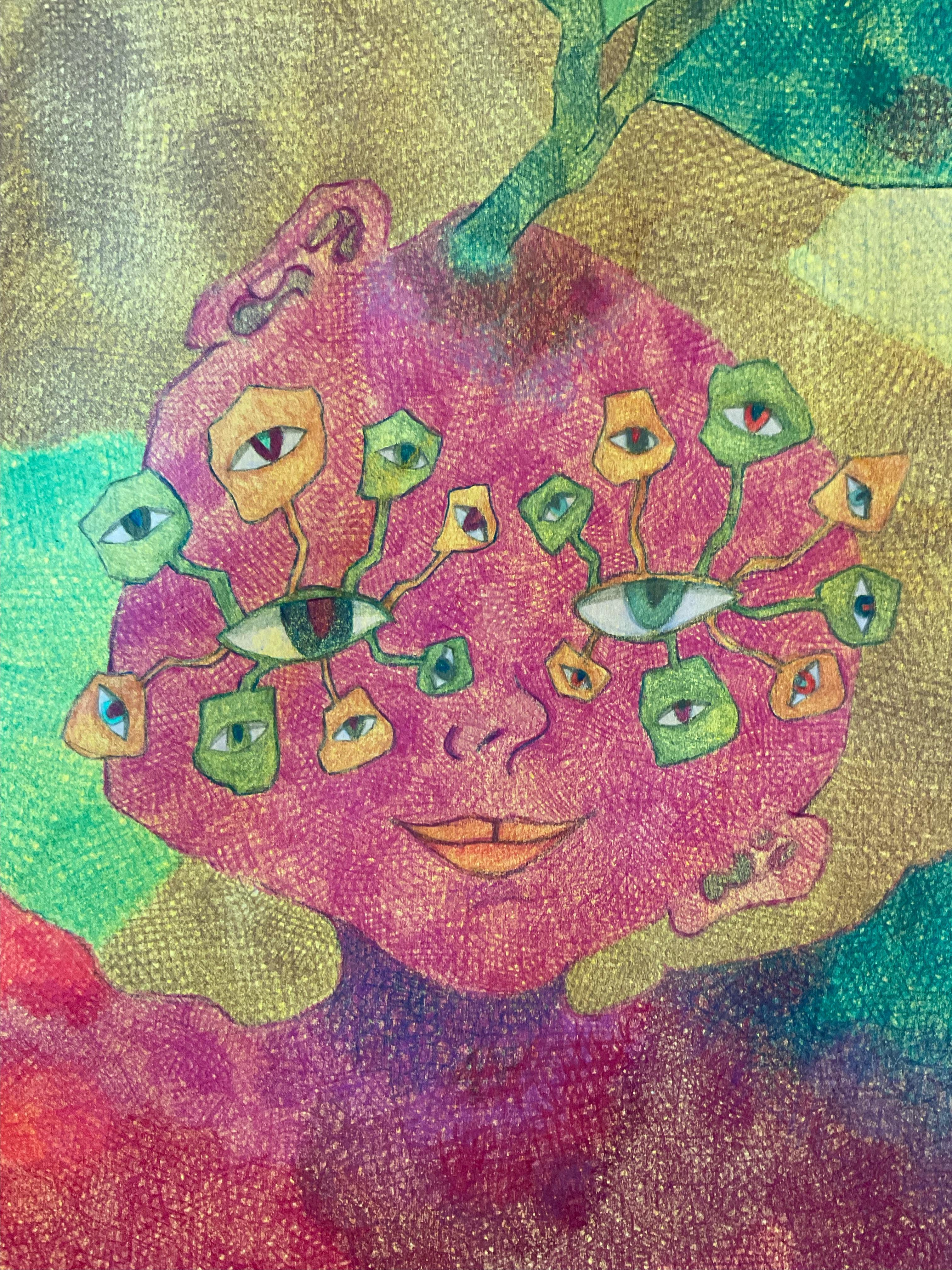 그렇게 용기가 돋아나는 동안, 그림의 내용도 나를 세상과 연결해 준다. 예를 들어, 내 그림에는 눈 주위에 여덟 개의 작은 눈을 달고 있는 천사가 등장한다. 눈 주위의 작은 눈들은 사실 처음에는 눈물이었고, 숫자 8은 무한대를 의미한다. 세상의 비극 앞에서 무한한 눈물을 흘리다 보니 그 눈물방울들이 무한한 눈이 된 것. 우리가 세상의 비극 앞에서 함께 울 때, 우리의 눈물이 곧 또 하나의 눈, 또 하나의 증인이 된다. 천사는 무조건 착하기만 한 존재가 아니라 세상의 비극을 눈 똑바로 뜨고 마주하며 그 슬픔에 참여하는 존재일 것이다. ‘천사 같은 사람’이란 바로 그런 사람일 것이다.